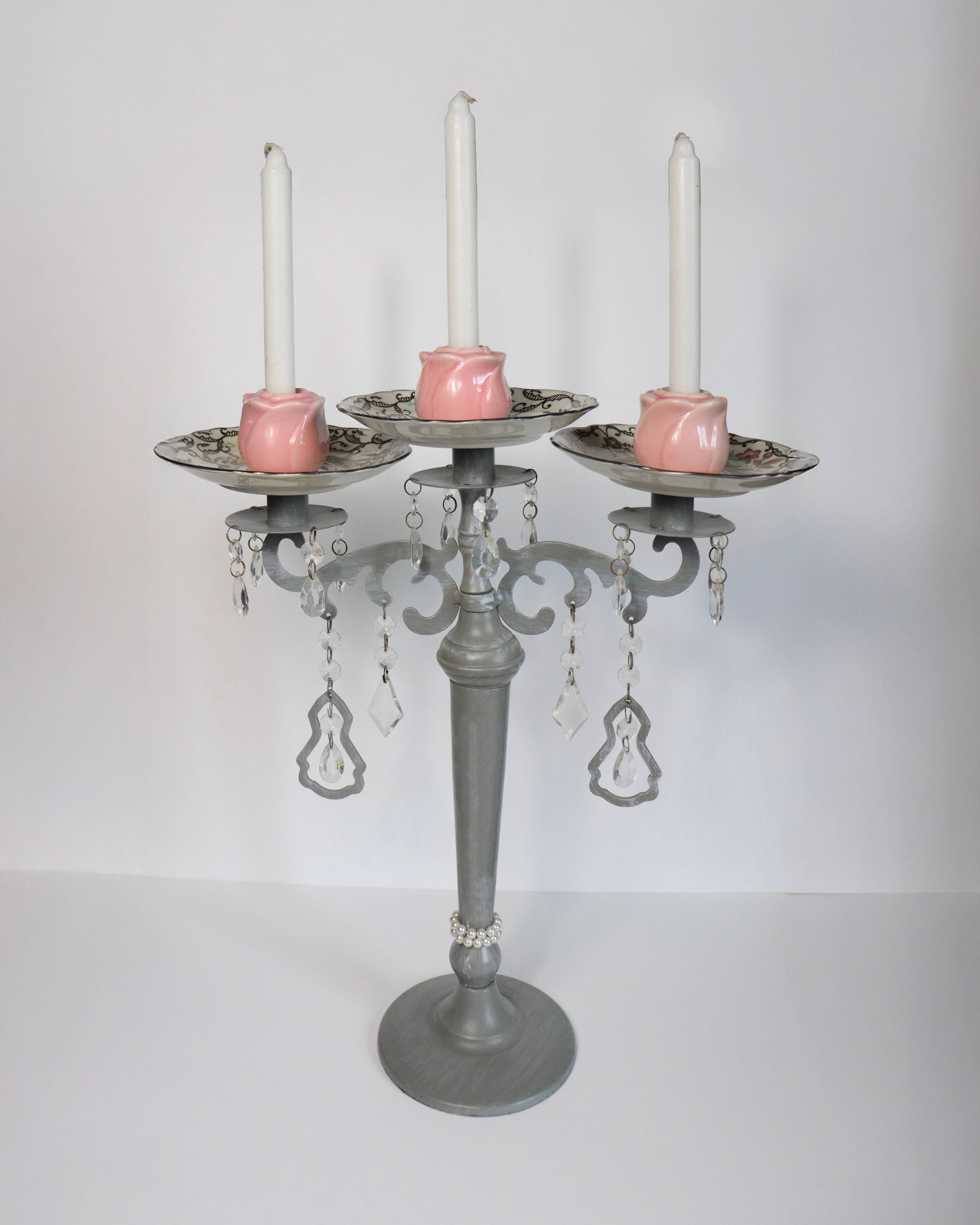 Chandelier ancien customisé avec pampilles, tasses anciennes et petits bougeoirs roses.